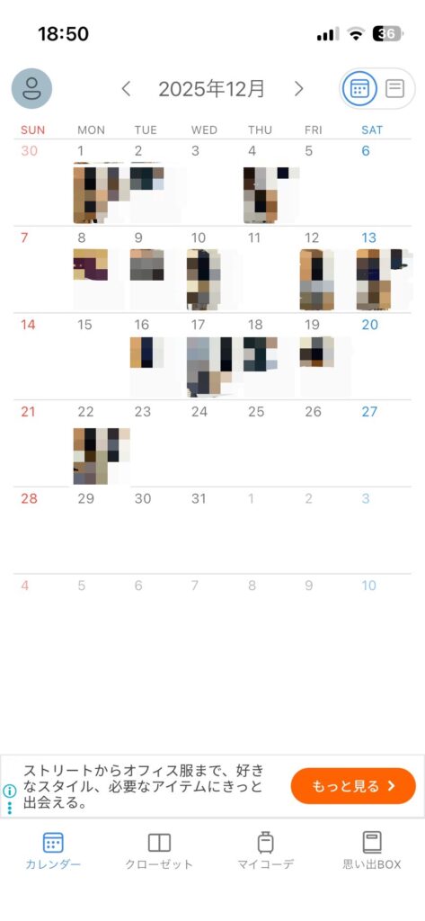 何を着たかをカレンダーで一覧表示もできます(ただ、画像が小さすぎてわかりにくい)。